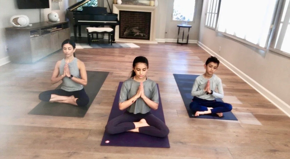 It’s important for all of us, of all ages, to keep up with our physical and mental health. It’s probably easier for us because kids are older and can get their work done without either of us being present. But even parents with younger kids are finding ways. My sister Seema, who has really young children, created a workout space for her family. She does weights, her husband on the treadmill, and they play fun music and the kids dance and mimic the parents in the background! My parents are going for walks in their garden. We also hold family facetime Senior Yoga sessions, incorporating chairs for their ease and safety. This gives them some connection with all of us while they try new postures and movements.